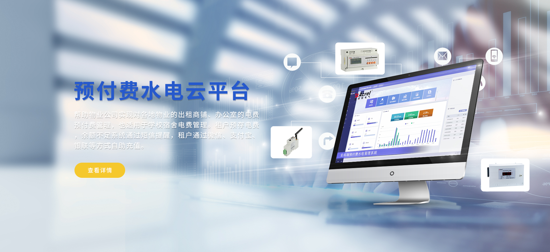 安科瑞提供的解決方案包括Acrel-EIoT能源物聯網云平臺變電所運維云平臺安全用電管理云平臺環保用電監管云平臺智慧消防云平臺、能源管理云平臺、工業企業能源管控平臺、遠程預付費云平臺、餐飲油煙監管云平臺、電動汽車/電瓶車充電樁收費管理云平臺、電力監控/無線測溫系統、電能質量治理系統、電氣火災監控系統、消防設備電源監控系統、防火門監控系統、應急照明和疏散指示系統、智能照明控制系統、醫用隔離電源絕緣監測系統等,幫助用戶實現能源智能化、可視化、精細化管理,提高用能效率和用能安全,為企業節能降耗和實現能源數字化建設提供數據服務。